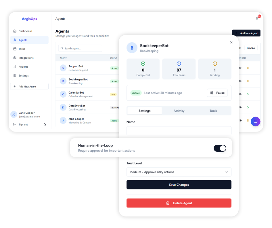 How might we help businesses safely delegate operational tasks to AI agents while maintaining transparency, oversight, and control over automated actions?