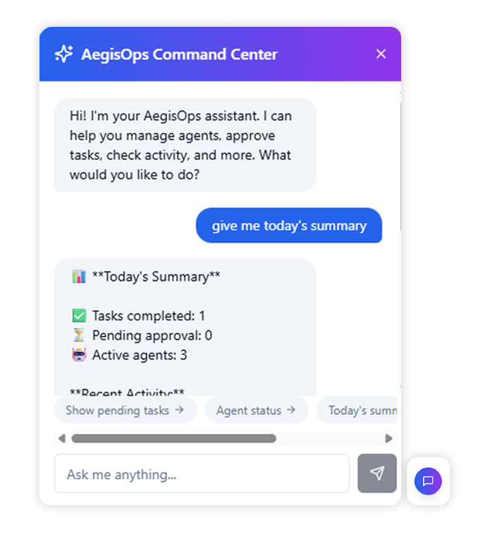 Managing multiple AI agents and tasks can become complex, especially as automation increases across different business operations. To simplify interaction with the system, AegisOps includes an AI Command Center assistant that allows users to manage the platform through a conversational interface.