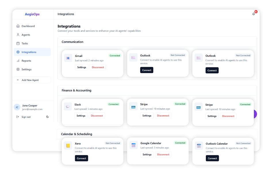AI agents need access to existing business tools in order to perform real work. The Integrations Hub allows users to connect external services that agents can interact with.