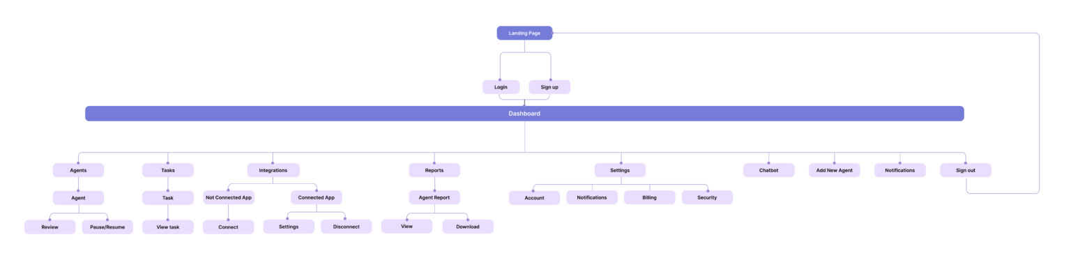 The goal was to create a simple, transparent, and trustworthy interface where users could deploy AI agents for different business roles, connect their business tools, monitor tasks performed by agents, approve sensitive actions, and track automation performance.