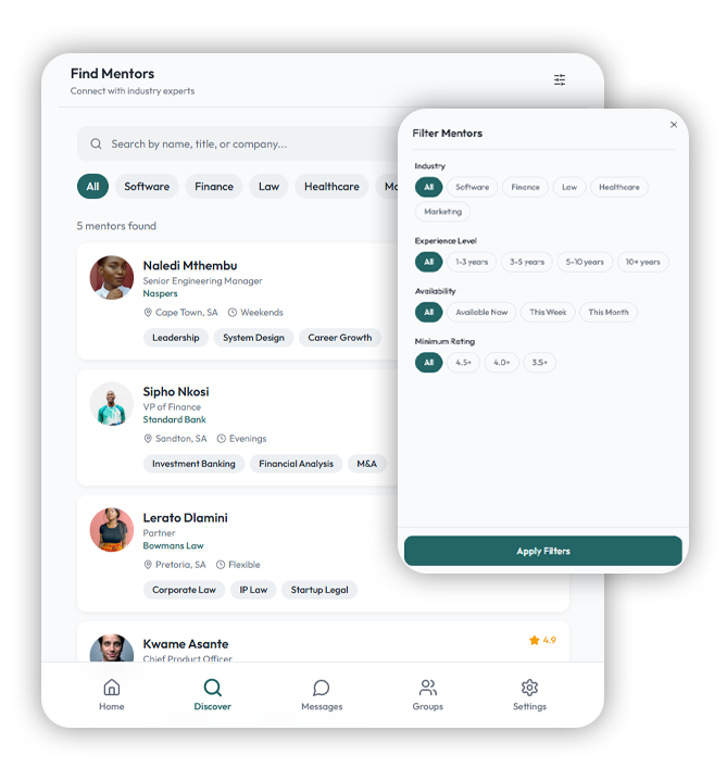 Finding the right mentor is one of the biggest barriers in mentorship platforms. This feature simplifies that process by allowing users to search and filter mentors based on highly relevant criteria, reducing decision fatigue and improving match quality.