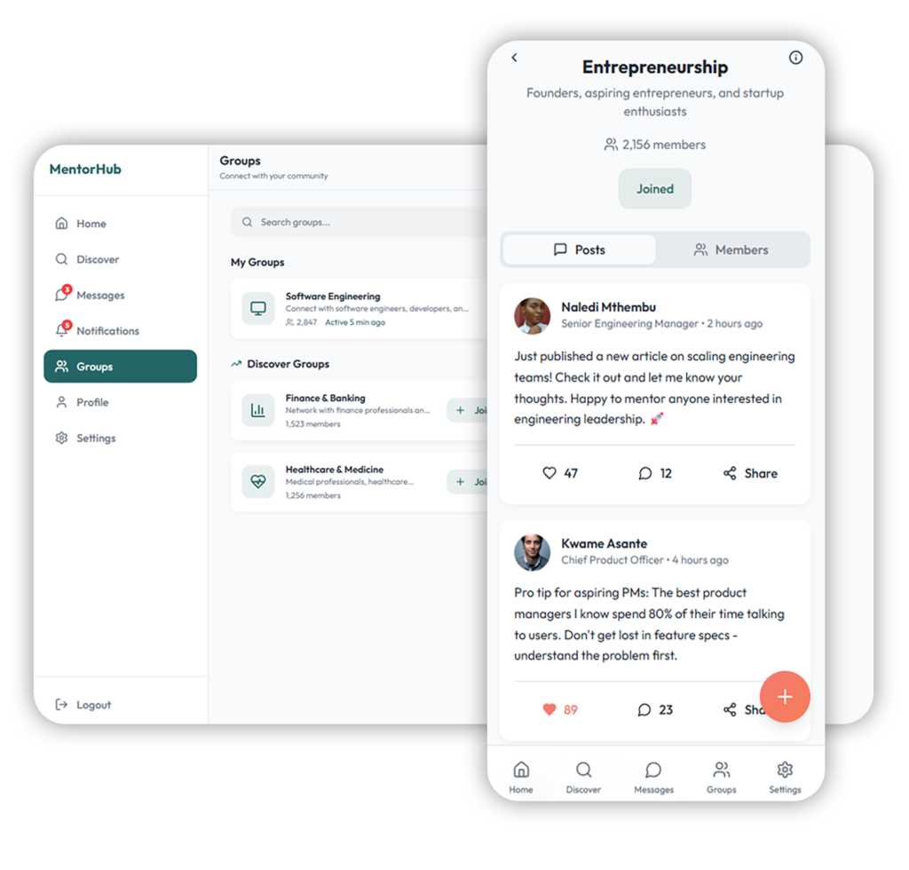 Beyond one-on-one mentorship, the platform fosters peer learning through industry-based communities. This creates a sense of belonging and enables users to learn from shared experiences, discussions, and insights.