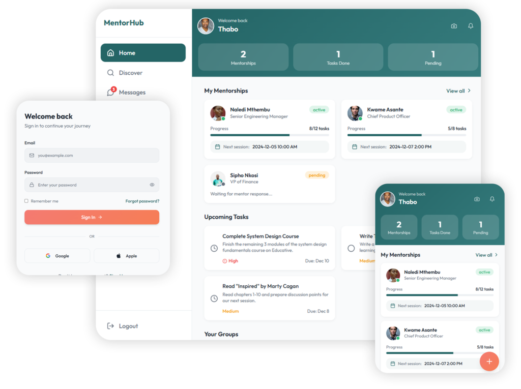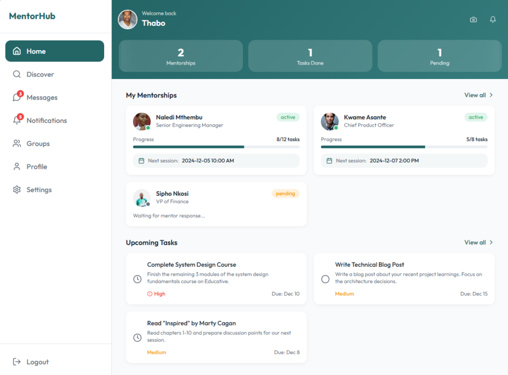 The dashboard acts as the central command center for mentees, giving them a clear overview of their mentorship journey at a glance. It transforms what is usually a vague experience into a structured, trackable system by combining progress visibility, upcoming sessions, and actionable tasks in one place.
